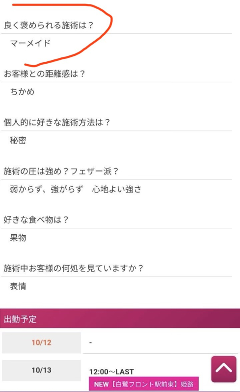 遠目で歩いていても透き通った空気管オーラが特徴的な女性です。近づけば近づくほど、癒されていく感覚、ご挨拶のときには力んだ肩の力もいつのまにか”フッ”と抜けていることに気づきます。 とても愛想のいい親しみやすい出会いになります。 施術に関しましては、その性格ゆえに開放的な内容で、お互いに打ち解けあい愛情を育んでいっても良いかもしれない。。。そういった普段は味わえないかもしれない安心できる時間になるでしょう♪ |